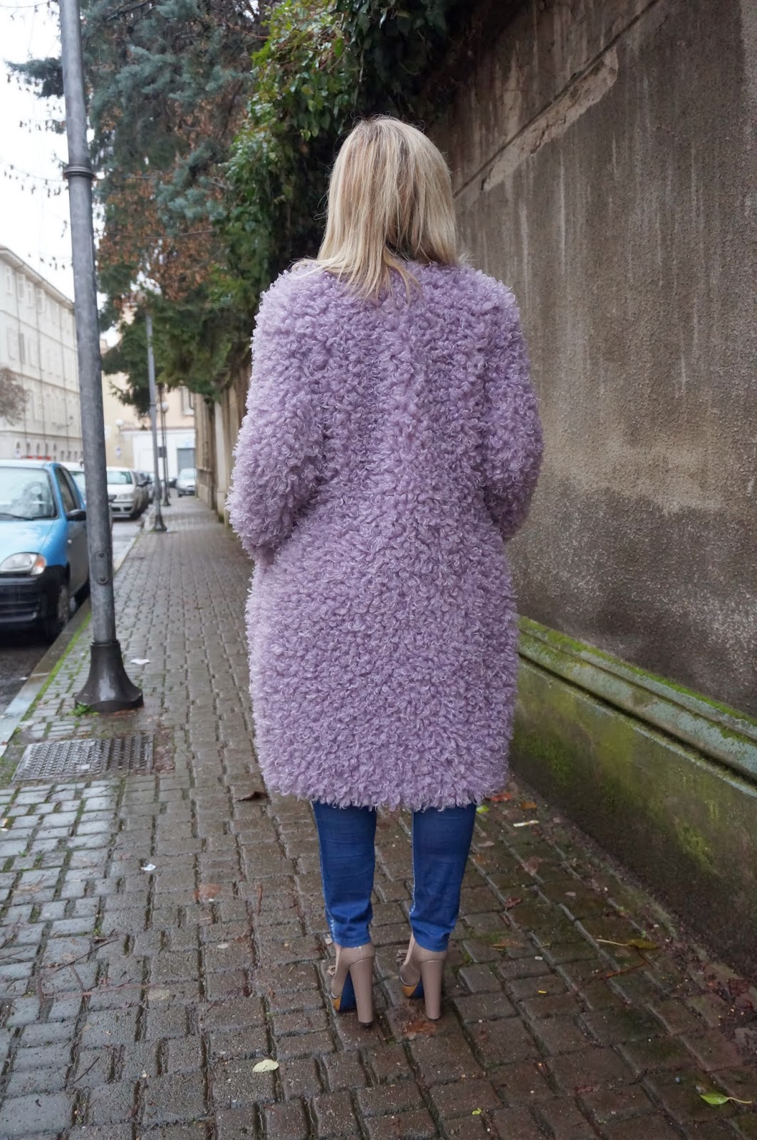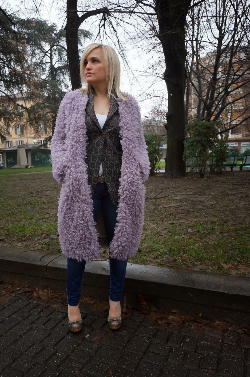 Ho indossato un accattivante cappottino di Manila Grace, molto caldo, e un blazer verde sempre di Manila Grace. Chiudono il look i miei jeans preferiti di Gas e le scarpe con tacco di Armani.