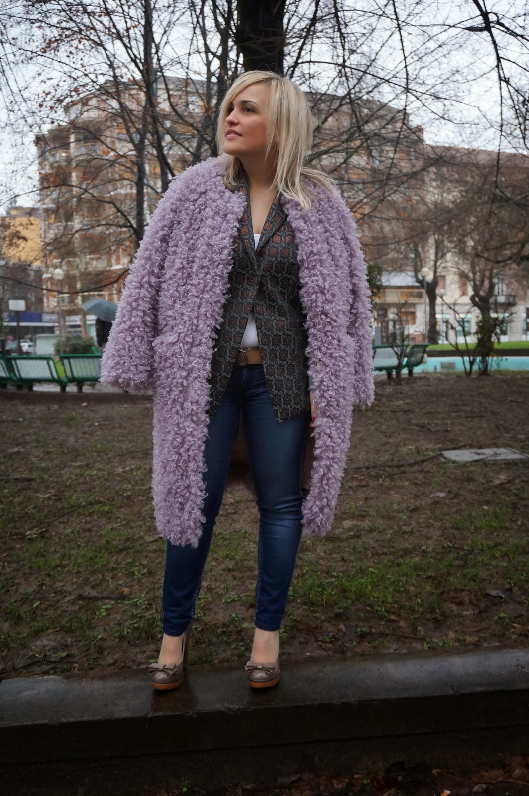 I wore a very eye-catching Manila Grace coat, so cozy and warm, and a green blazer by Manila Grace too. My fave jeans ever by Gas and pumps by Armani closed the look.